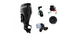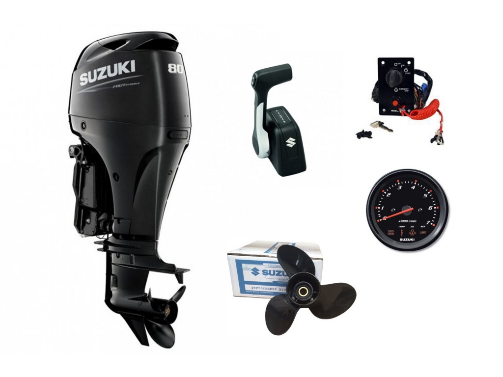 Suzuki DF80 ATL - pakabinamas benzininis variklis su elektriniu starteriu, generatoriumi ir hidrauliniu kojos pakėlėju. Komplekte nuotolinio valdymo pultelis, sraigtas, tachometras ir spynelė.